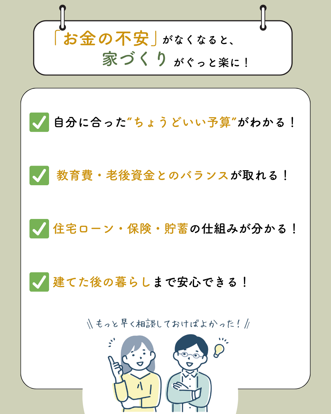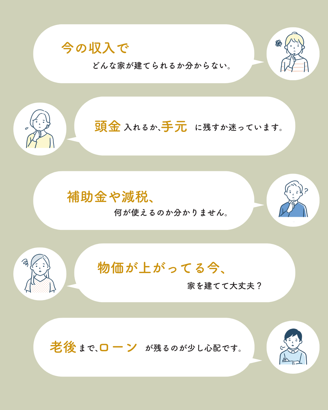 家づくりのご相談をいただくお客様の多くが、最初にお話しされるのは“お金の不安”です。