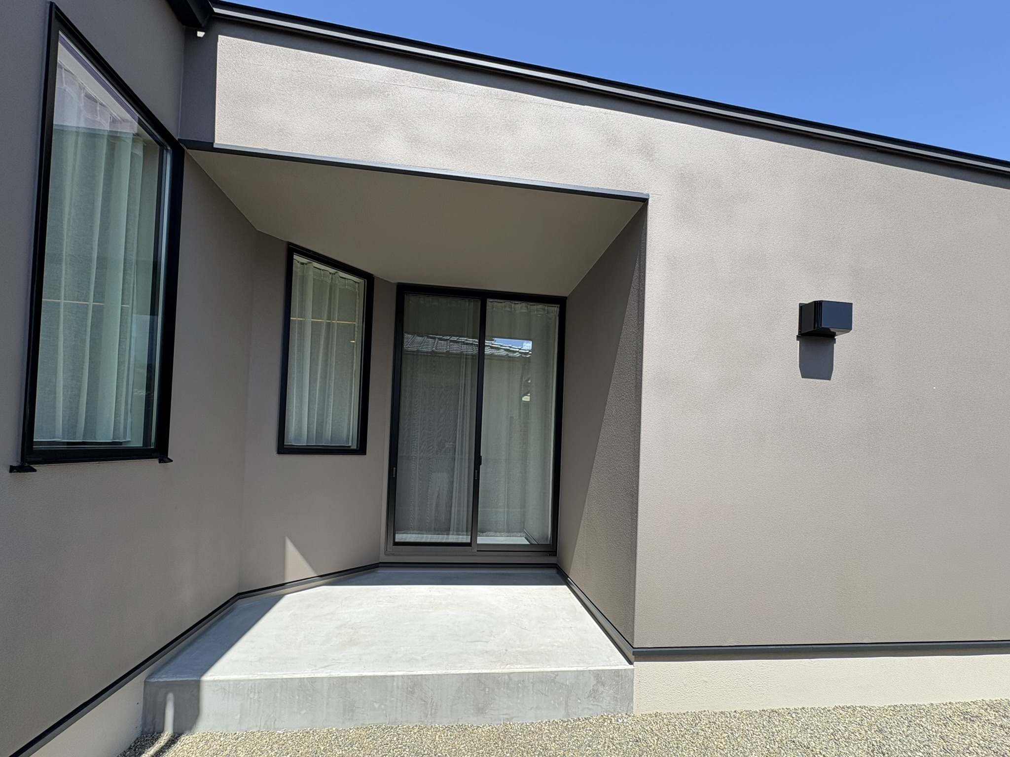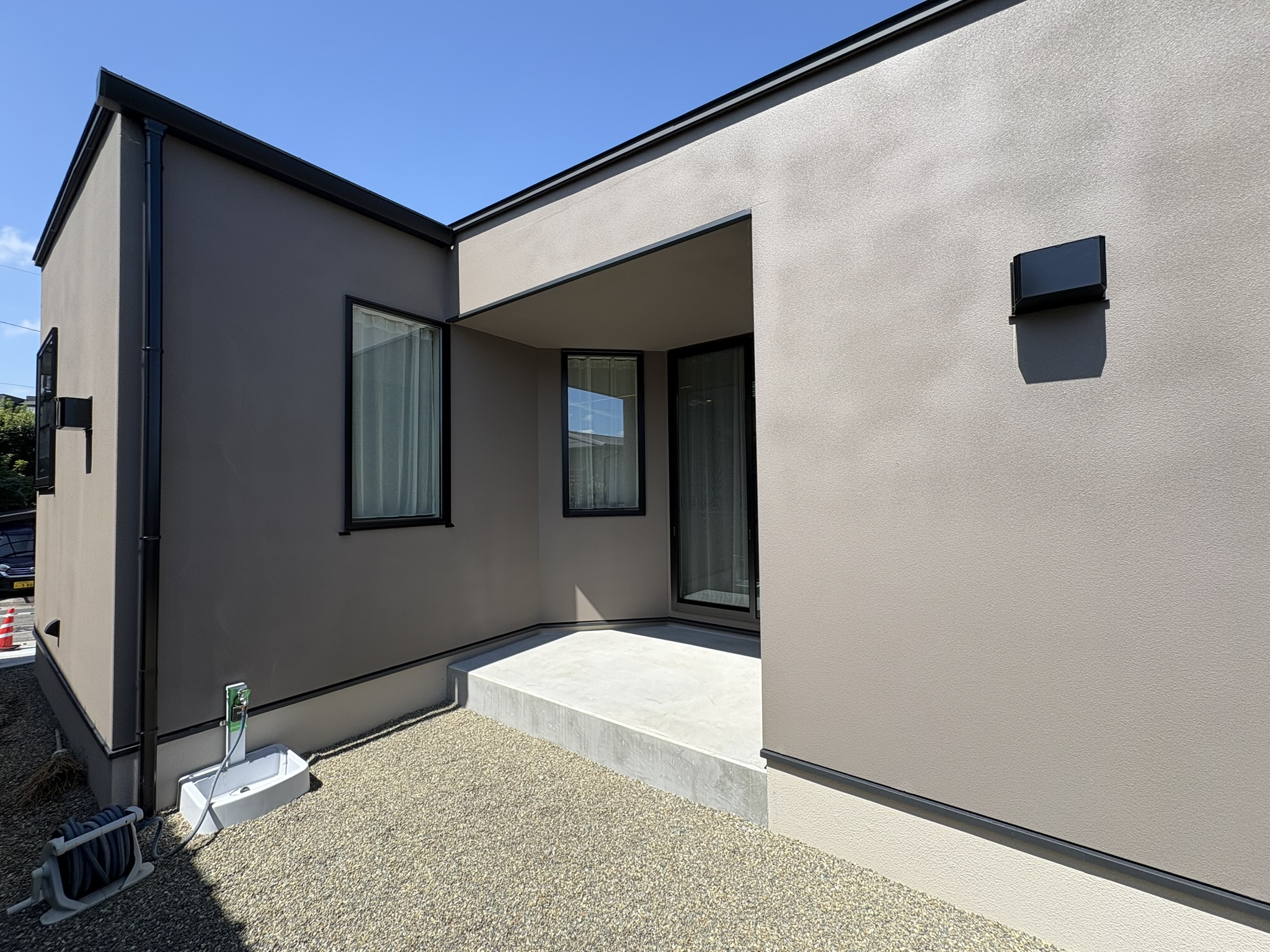 グレージュの外壁にダークトーンの屋根を組み合わせ、シンプルで上質な外観に。